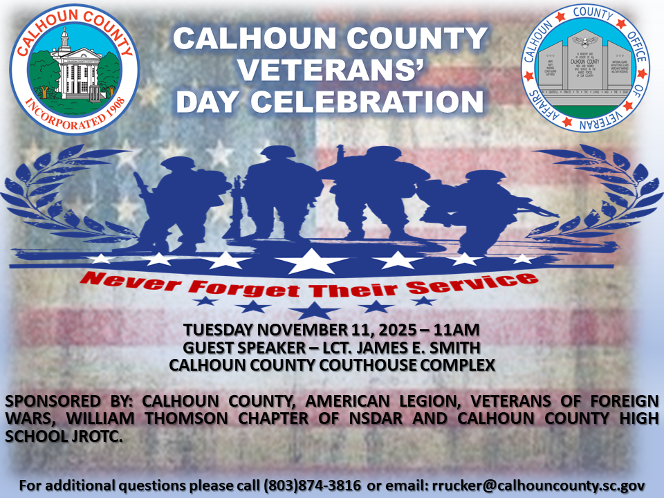 The 2025 Calhoun County Veterans' Day Celebration will be held Tuesday, November 11, 2025 at 11 AM at the Calhoun County Courthouse Complex. Please see the attached flyer for additional information.